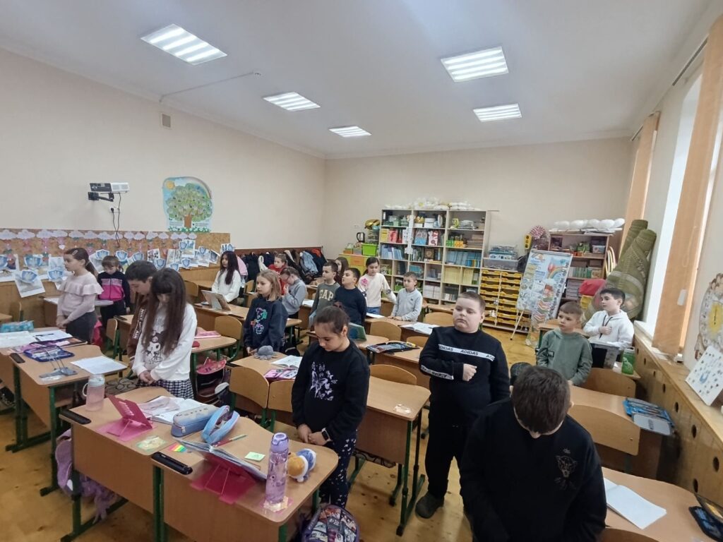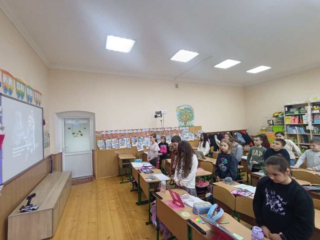 Загальношкільна хвилина мовчання. Ми схилили голови в глибокій пошані перед пам’яттю кожного воїна, кожного волонтера та кожного мирного українця, чиє життя забрала ця війна. Тиша, яка промовляє гучніше за тисячі слів. У цій тиші — імена рідних, які вже ніколи не заберуть дітей зі школи. У цій тиші — вдячність кожному воїну, який тримає над нами небо. Хвилина, що триває вічність.